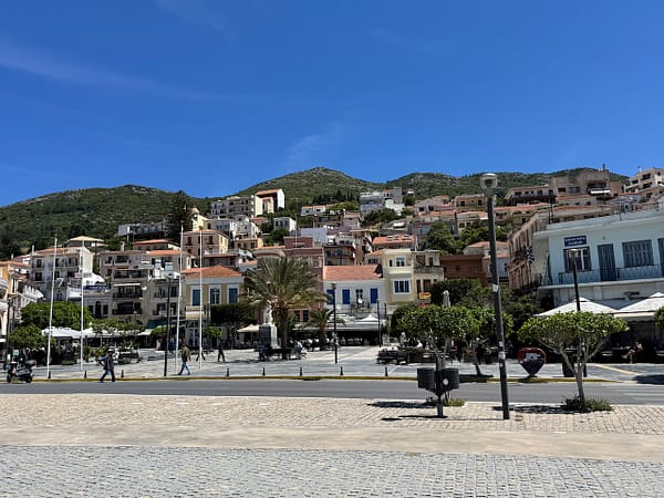 Hierna door de bergen doorgereden naar het vissersdorp Kokkari. Kokkari ligt te midden van een prachtig gebied met wijngaarden, pijnbomen en olijfbomen. Het is een populaire badplaats die vooral bezoekers trekt vanwege de schilderachtige architectuur en de ontspannen sfeer. Tijdens een vakantie in Kokkari kun je genieten van het idyllische landschap, het leuke dorp en de mooie stranden. Kristalhelder water, diverse watersporten en een mooie omgeving maken dit dorp tot een ideale plek. Toen wij er aankwamen was het er erg stil en was er weinig open. Wellicht omdat het nog in mei was, maar er was weinig sfeer te bekennen.
